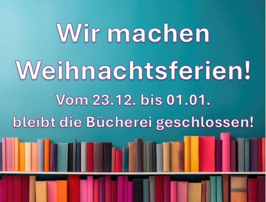 die Bücherei macht in diesem Jahr „Weihnachtsferien“. Wir haben vom 23.12.2025 bis einschließlich 01.01.2026 geschlossen. Ab dem 02.01.2026 sind wir dann wieder für Sie da – sogar mit neuer Leiterin!