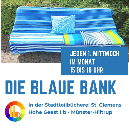 Stadtteilbücherei St. Clemens Hohe Geest 1b, Münster-Hiltrup, NRW, DeutschlandEin Gesprächsangebot für alle: Jeden ersten Mittwoch im Monat steht das Team der „Blauen Bank“ von 15:00 bis 18:00 Uhr in der Stadtteilbücherei St. Clemens zur Verfügung. Willkommen sind alle, die sich austauschen möchten oder einfach einen Moment des Innehaltens suchen. Das Team der „Blauen Bank“ freut sich auf viele Begegnungen und auf Ihren Besuch!