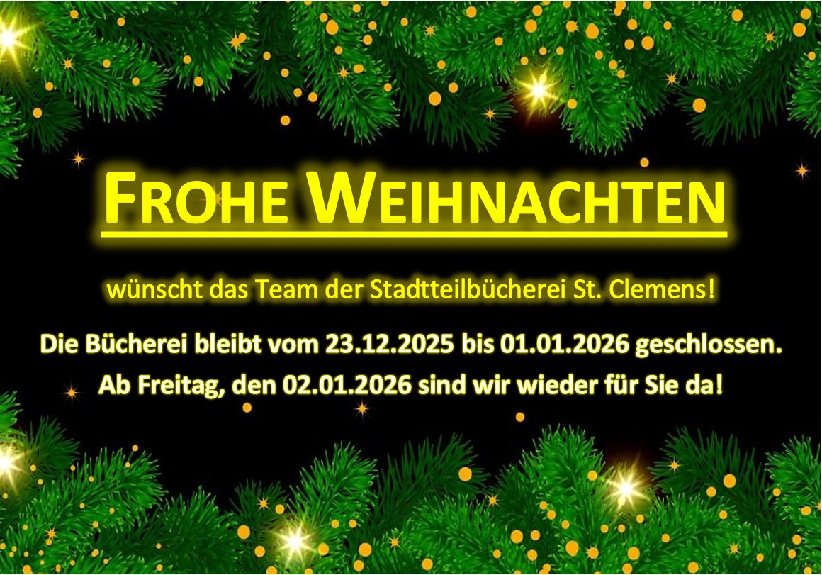 Stadtteilbücherei St. Clemens Hohe Geest 1b, Münster-Hiltrup, NRW, DeutschlandZwischen Weihnachten und Neujahr ist die Bücherei nicht geöffnet. Die Rückgabefristen werden den Schließzeiten entsprechend angepasst. Beachten Sie bitte die Datumsangaben auf Ihrem Ausleih-Bon oder kontrollieren Sie es noch einmal […]